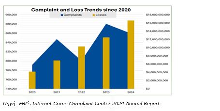 Σύμφωνα με το Κέντρο Παραπόνων για Εγκλήματα στο Διαδίκτυο (Internet Crime Complaint Center) (IC3), συνεργασία του FBI και του National White Collar Crime Center στις ΗΠΑ, το 2024 μόνο καταγράφηκαν 860.000 αναφορές απάτης, με συνολικές δηλωμένες απώλειες ύψους $16,6 δισεκατομμυρίων. Παρόλο που ο αριθμός των καταγγελιών αυξήθηκε μόλις κατά 10% σε σχέση με το 2020, οι οικονομικές απώλειες εκτινάχθηκαν κατά 319%, δείχνοντας ότι οι απάτες είναι πλέον πολύ πιο επιζήμιες και καταστροφικές από ποτέ.