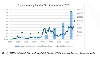 Το 2024, 40% των συνολικών δηλωμένων απωλειών προήλθε από επενδυτικές απάτες, που παρασύρουν άτομα να επενδύσουν σε ψεύτικες ευκαιρίες, όπως πλαστά συνταξιοδοτικά προγράμματα, πυραμίδες ή «εγγυημένες» επενδύσεις υψηλής απόδοσης. Αυτά τα σχέδια υπόσχονται γρήγορα και εύκολα κέρδη χωρίς ρίσκο, καθιστώντας τα ιδιαίτερα ελκυστικά. Η απάτη με κρυπτονομίσματα αυξάνεται παράλληλα με την ίδια την αγορά των ψηφιακών κρυπτονομισμάτων. Καθώς η αξία του Bitcoin και άλλης ψηφιακής περιουσίας αυξάνεται, ο φόβος ότι κάποιος θα «χάσει την ευκαιρία» ωθεί πολλούς να κυνηγούν το «επόμενο μεγάλο νόμισμα». Οι απατεώνες εκμεταλλεύονται αυτήν τη δίψα για γρήγορο κέρδος, υποσχόμενοι θεαματικές αποδόσεις, αλλά τελικά αφήνουν τα θύματα με άδειες τσέπες.