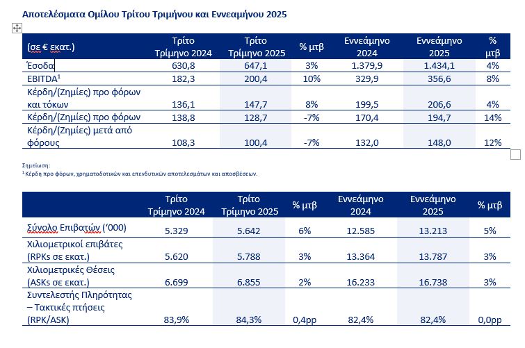 Ο ενοποιημένος Κύκλος Εργασιών για το εννεάμηνο του 2025 ανήλθε σε €1,43 δισ., αυξημένος κατά 4% σε σχέση με το αντίστοιχο διάστημα του 2024. Ο Όμιλος προσέφερε 16,0 εκατ. θέσεις και μετέφερε 13,2 εκατ. επιβάτες, 5% περισσότερους σε σχέση με την περσινή περίοδο, εκ των οποίων 7,7 εκατ. επιβάτες από/προς προορισμούς του εξωτερικού και 5,5 εκατ. επιβάτες στο δίκτυο εσωτερικού.