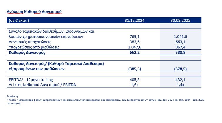 Τα ταμειακά διαθέσιμα, ισοδύναμα και λοιπές χρηματοοικονομικές επενδύσεις διαμορφώθηκαν σε €1.041,6 εκατ.[1] στις 30.09.2025.