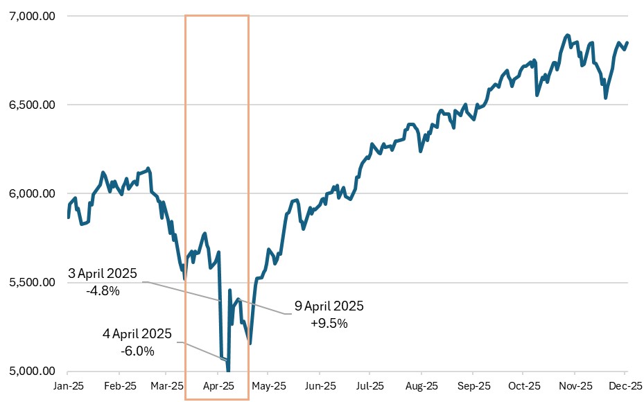 Γράφημα 1: S&P 500 - Ημερήσιες τιμές κλεισίματος και επιλεγμένες αποδόσεις το 2025
