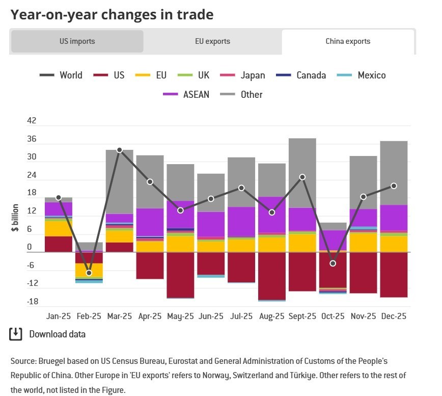 Οι εξαγωγές της Κίνας παρέμειναν ισχυρές, με τη σημαντική πτώση των εξαγωγών προς τις ΗΠΑ να αντισταθμίζεται από τις υψηλότερες εξαγωγές προς τις χώρες του ASEAN-7 (Ινδονησία, Μαλαισία, Ταϊλάνδη, Φιλιππίνες, Βιετνάμ, Λάος και Καμπότζη), την ΕΕ και άλλες αγορές, με αποτέλεσμα τη συνολική ετήσια αύξηση των εξαγωγών κατά 22 δισεκατομμύρια δολάρια (6,6%) έως τον Δεκέμβριο του 2025.