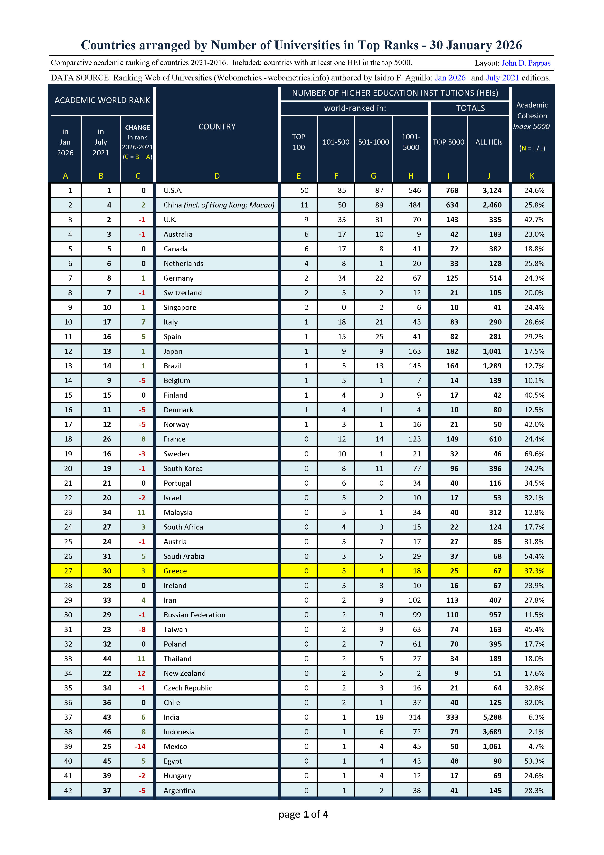 Κατά την πενταετία αυτή, η Ελλάδα (27η) προσπέρασε πέντε χώρες στην παγκόσμια κατάταξη Webometrics: