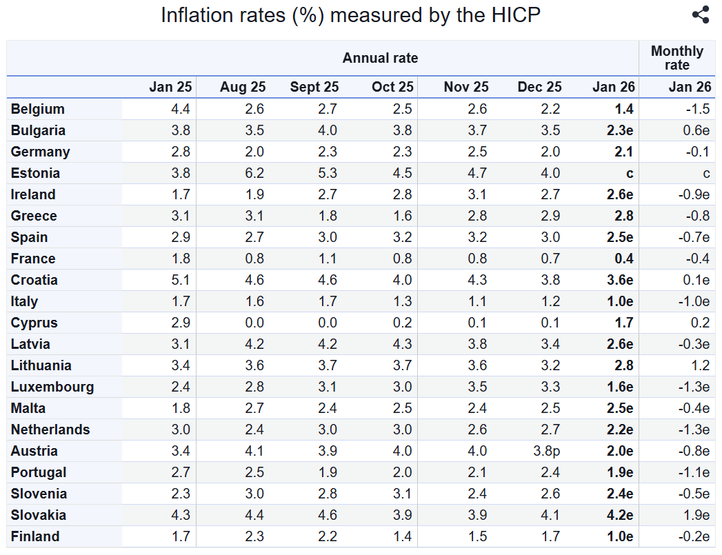 Την ίδια περίοδο, ο ετήσιος πληθωρισμός στην ευρωζώνη παρουσίασε αποκλιμάκωση, υποχωρώντας στο 1,7% τον Ιανουάριο από 2% τον Δεκέμβριο. Παράλληλα, σε μηνιαίο επίπεδο, οι τιμές μειώθηκαν κατά 0,5%.