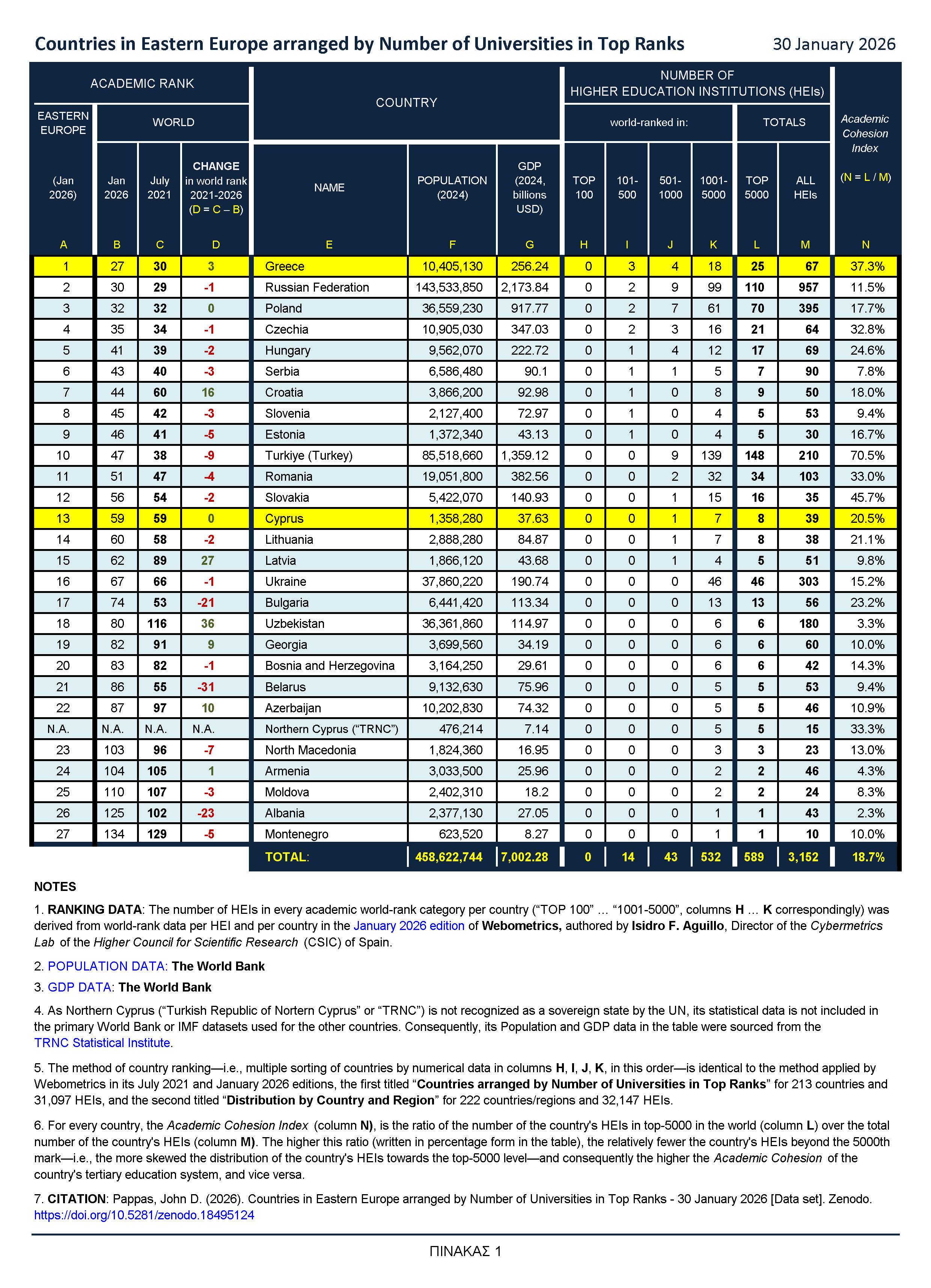 Στην παγκόσμια ακαδημαϊκή κατάταξη χωρών για το 2026 από την Webometrics [1], η Ελλάδα κατατάσσεται πρώτη στην Ανατολική Ευρώπη, υπερβαίνοντας τις υπόλοιπες 26 χώρες αυτής της ευρείας γεωπολιτικής περιοχής των 425 εκατομμυρίων κατοίκων.[2] Πίσω της βρίσκονται η Ρωσία, η Πολωνία, η Τσεχία, η Ουγγαρία, η Σερβία, η Κροατία, η Σλοβενία, η Εσθονία, η Τουρκία, η Ρουμανία κ.τ.λ.