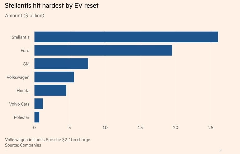 Αυτό το μήνα, η Stellantis κατέγραψε ένα κόστος της τάξης των 26 δισ. δολαρίων προκειμένου να καταργήσει ορισμένα πλήρως ηλεκτρικά μοντέλα και να αναβιώσει τον δημοφιλή κινητήρα V8 «Hemi» 5,7 λίτρων στις ΗΠΑ. Πρόσφατα αποφάσισε επίσης να αναβιώσει τους κινητήρες ντίζελ για διάφορα ευρωπαϊκά μοντέλα. Η απομείωση προκάλεσε πώληση μετοχών που μείωσε την αγοραία αξία της εταιρείας κατά περίπου 6 δισ. δολάρια.