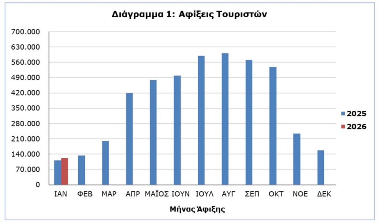 Ανοδική τροχιά κατέγραψε ο τουρισμός τον Ιανουάριο του 2026, επιβεβαιώνοντας τη δυναμική εκκίνηση της νέας χρονιάς. Σύμφωνα με τα τελευταία στοιχεία της Στατιστικής Υπηρεσίας, οι αφίξεις τουριστών έφθασαν τις 121.625, παρουσιάζοντας αύξηση 8,5% σε σύγκριση με τις 112.100 αφίξεις του Ιανουαρίου 2025.