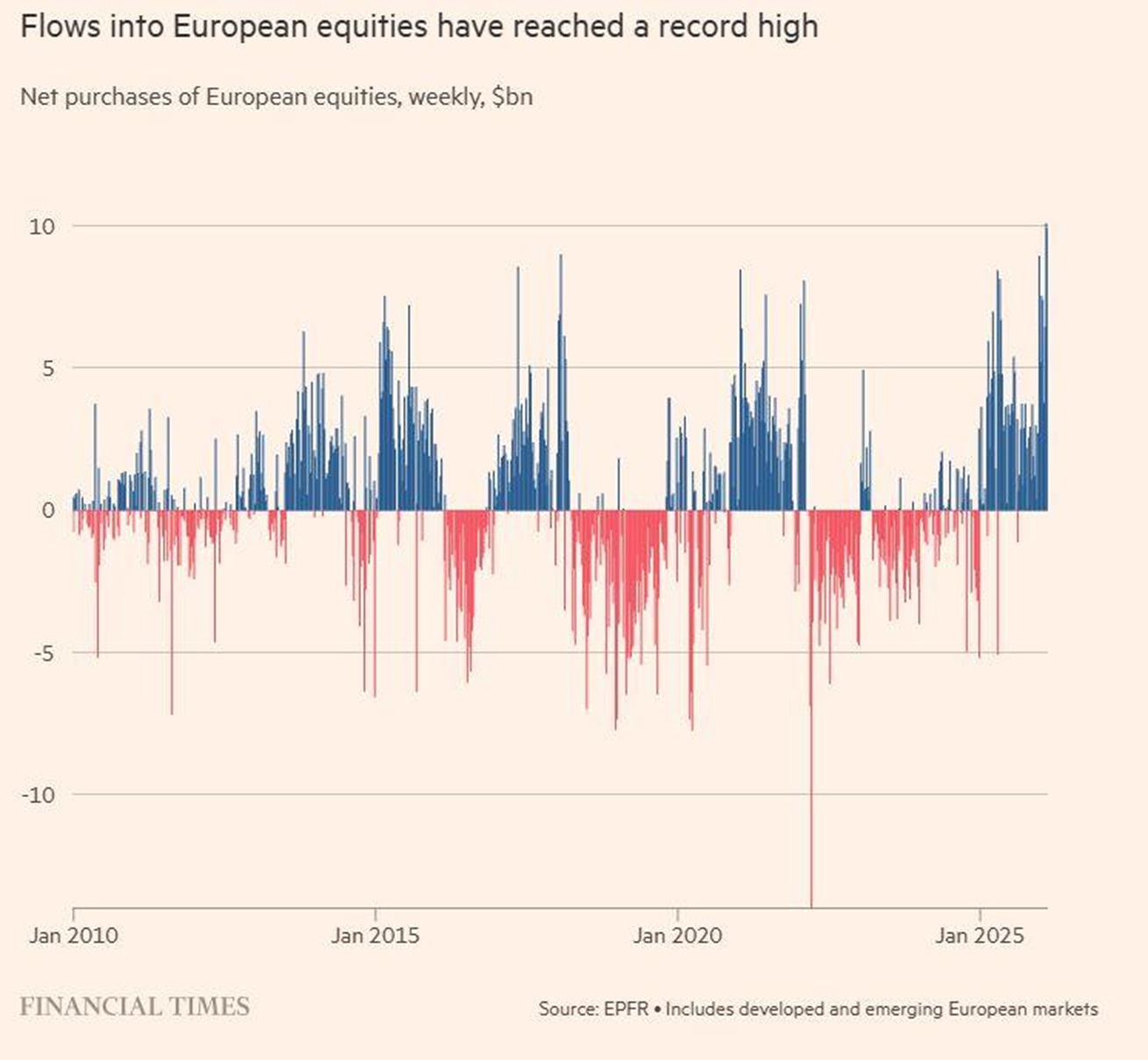 Οι ευρωπαϊκές μετοχές τείνουν να κλείσουν τον Φεβρουάριο με τις υψηλότερες μηνιαίες εισροές που έχουν σημειωθεί ποτέ, μετά από δύο συνεχόμενες εβδομαδιαίες εισροές ρεκόρ ύψους περίπου 10 δισ. δολαρίων, σύμφωνα με στοιχεία της EPFR, η οποία παρακολουθεί τις ροές των ETF και των αμοιβαίων κεφαλαίων, όπως γράφουν οι FT.