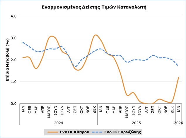 Αύξηση 1,2% κατέγραψε ο Εναρμονισμένος Δείκτης Τιμών Καταναλωτή (ΕΔΤΚ) τον Ιανουάριο του 2026 σε σύγκριση με τον Ιανουάριο του 2025, ενώ σε σχέση με τον προηγούμενο μήνα σημείωσε μείωση 0,3%, σύμφωνα με τα στοιχεία που έδωσε σήμερα στη δημοσιότητα η Στατιστική Υπηρεσία.