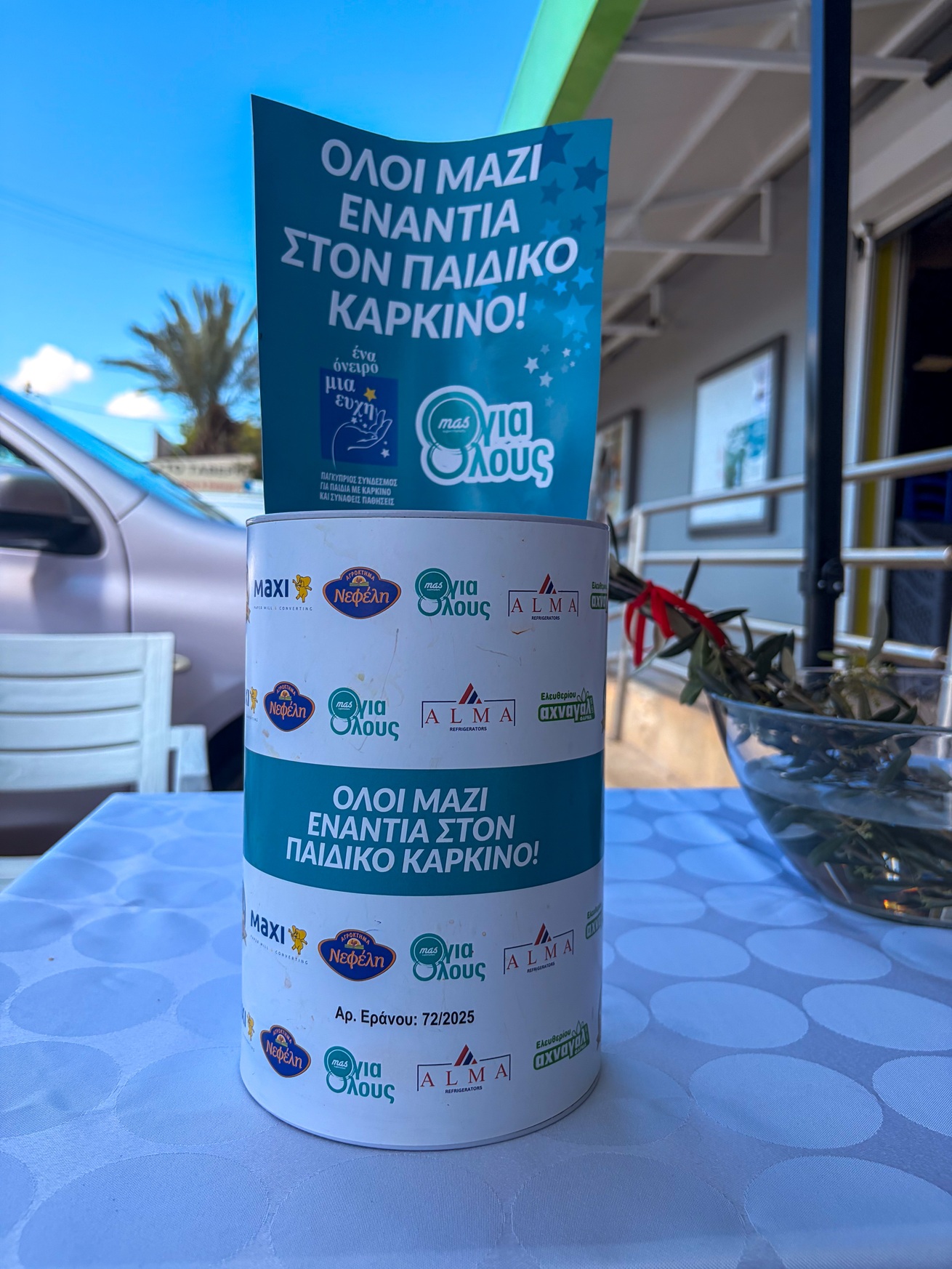 Η συγκεκριμένη ενέργεια πραγματοποιείται στο πλαίσιο της εταιρικής υπευθυνότητας και προσφοράς του προγράμματος «Mas… για Όλους!» με την πολύτιμη συμβολή των χορηγών ALMA, ΑΜΑΛΙΑ, ΑΧΝΑΓΑΛ, ΑΓΡΟΚΤΗΜΑ ΝΕΦΕΛΗ και ΜΑΧΙ.