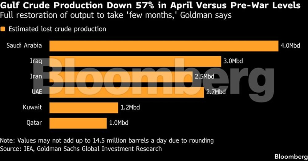 Η παραγωγή πετρελαίου από τις χώρες του Περσικού Κόλπου κινείται αυτόν τον μήνα κατά 14,5 εκατ. βαρέλια ημερησίως χαμηλότερα σε σύγκριση με τα επίπεδα πριν από τον πόλεμο, σύμφωνα με τη Goldman Sachs, η οποία εκτιμά ότι οποιαδήποτε επαναφορά της προσφοράς θα απαιτήσει μήνες.