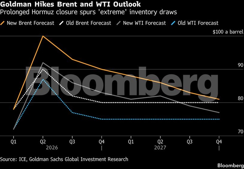 Η Goldman Sachs αναθεώρησε ανοδικά τις προβλέψεις της για τις τιμές του πετρελαίου, προειδοποιώντας ότι η παρατεταμένη κρίση στα Στενά του Ορμούζ προκαλεί «ακραία» μείωση των παγκόσμιων αποθεμάτων αργού.